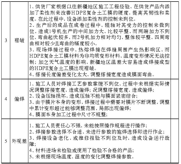 復(fù)合土工膜焊接施工常見的質(zhì)量問題主要有若焊、過焊、漏焊、褶皺、焊道偏焊等表現(xiàn)形式。為有效解決以上問題,降低其對工程質(zhì)量帶來的不良影響,提高工程施工焊接質(zhì)量,我們認真分析影響焊接質(zhì)量的各影響因素,以質(zhì)量管理的“五要素”為切入點。