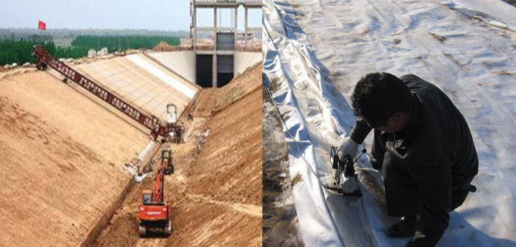 土工膜在搬運過程防止尖銳物體損傷膜;膜的裁剪寬度是根據坡面長度加上溝槽深寬度和上坡面水平面的壓實寬度,根據蓄水深度用勾股定理計算坡面長度,一般溝槽埋壓40cm,水平面壓30cm即可,三者相加即裁剪寬度,現場裁剪施工時場地要平整,同時避免有風雨天氣,由于池塘周長的關系,一般都需進行拼接,拼接方法有焊接、縫接、粘接三種,焊接需要有專業焊接機和專業人員施工,粘接需要特殊膠粘劑,兩者在現場施工較為繁瑣,實際操作基本采用縫接方法,用聚乙烯線機器或手工縫接即可,縫接采取相嵌式。